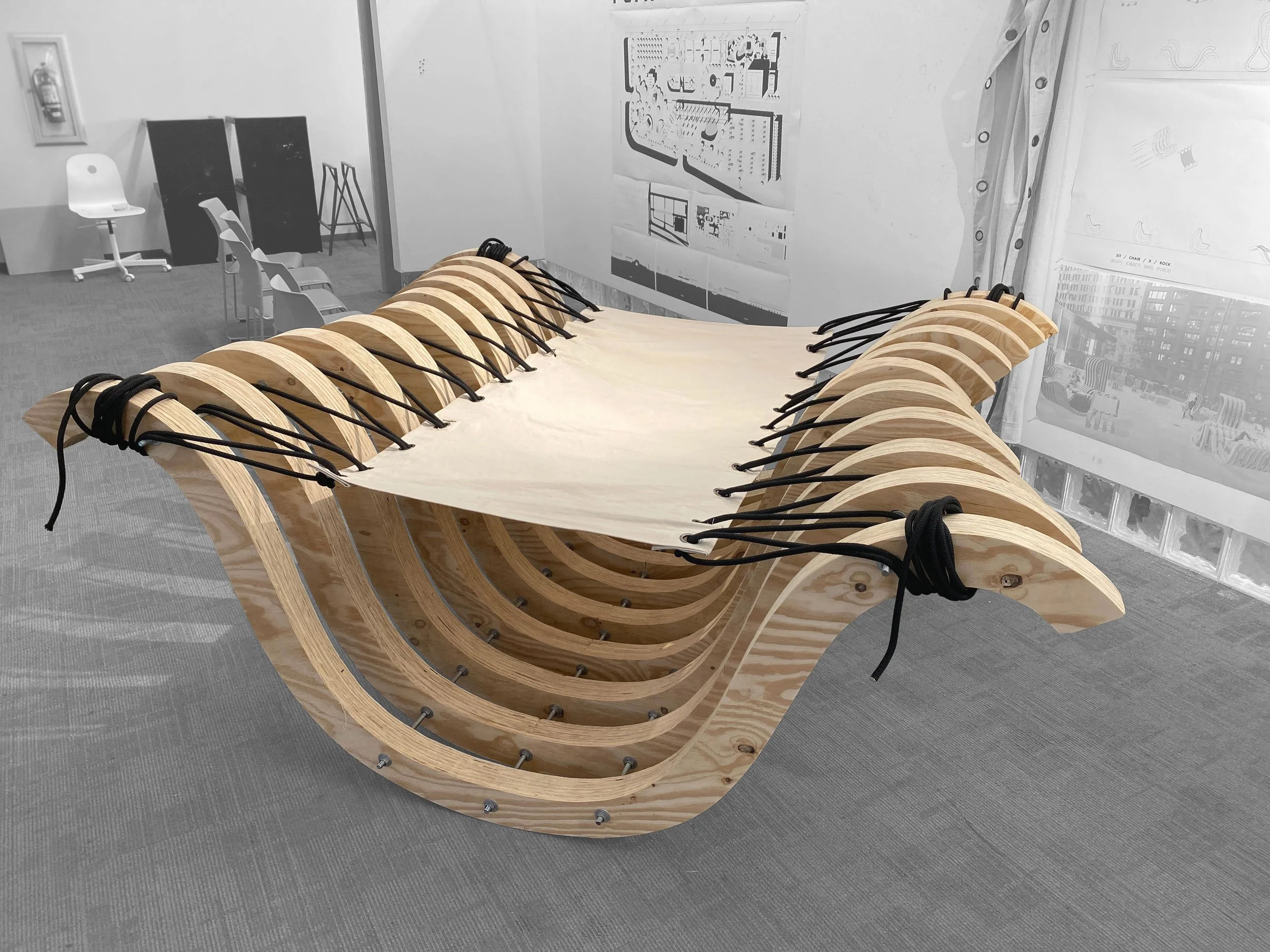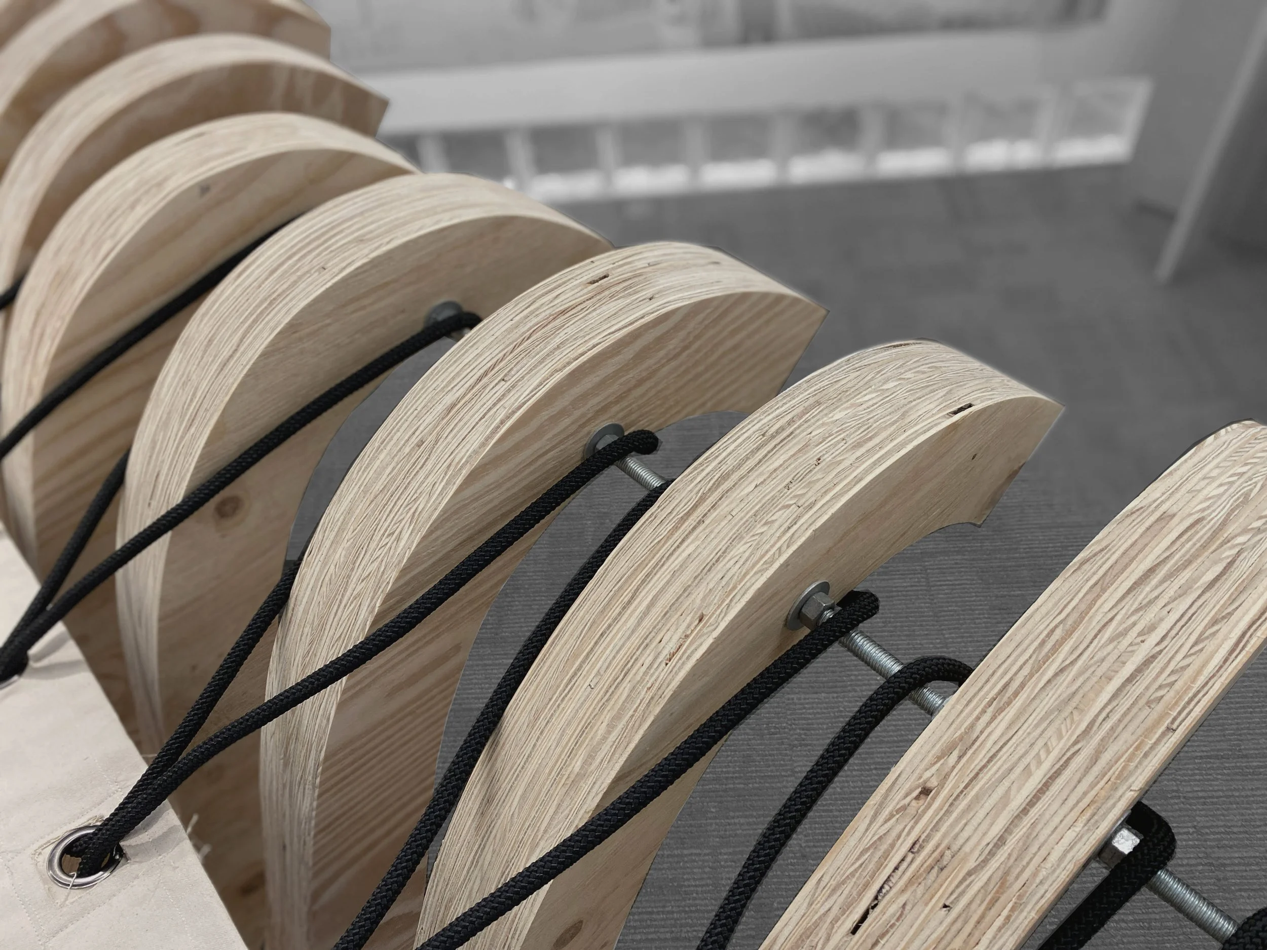 Physical model made of plywood, galvanized steel rods, nuts + washers, static climbing rope, metal grommets, and duck canvas. New seat prototype is made of 550 paracord. Model fabrication included use of jigsaw to manually cut all pieces, use of handheld belt sander and palm sander on wood pieces, sawing rods to correct size, design and fabrication of canvas on sewing machine, fabrication of paracord mesh by hand.
