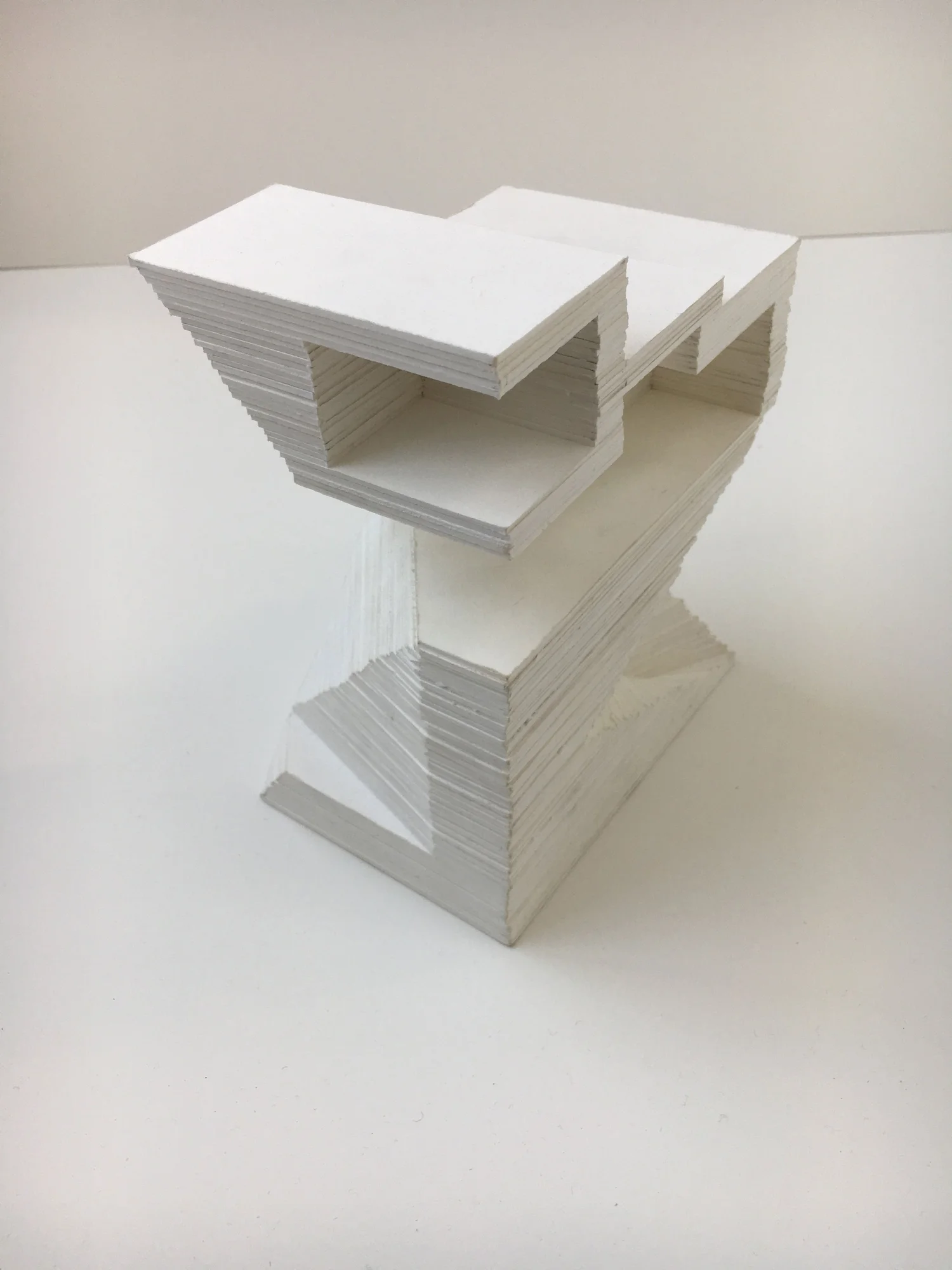 Charged with translating the two-dimensional investigation into a three-dimensional stack model, the process becomes about extruding the plans. When turned on its side, the stack model is almost identical to the plan drawing. Lines are carried through the model, creating a language of slipping that allows the viewer to see moments of connection and separation between the three pieces of the top as well as the base.