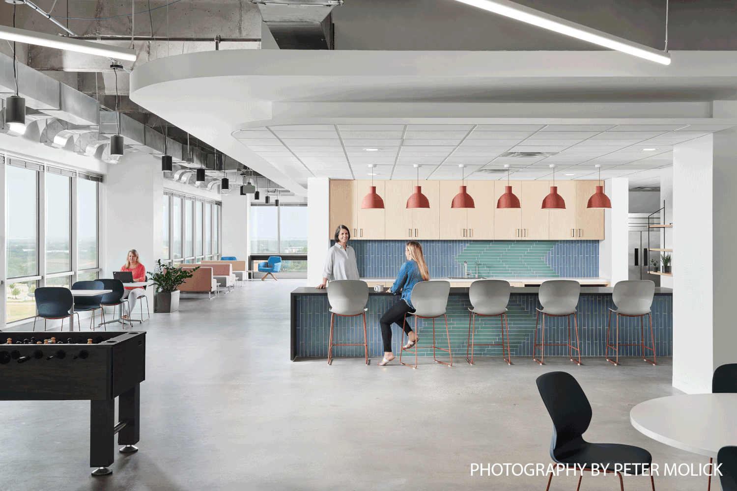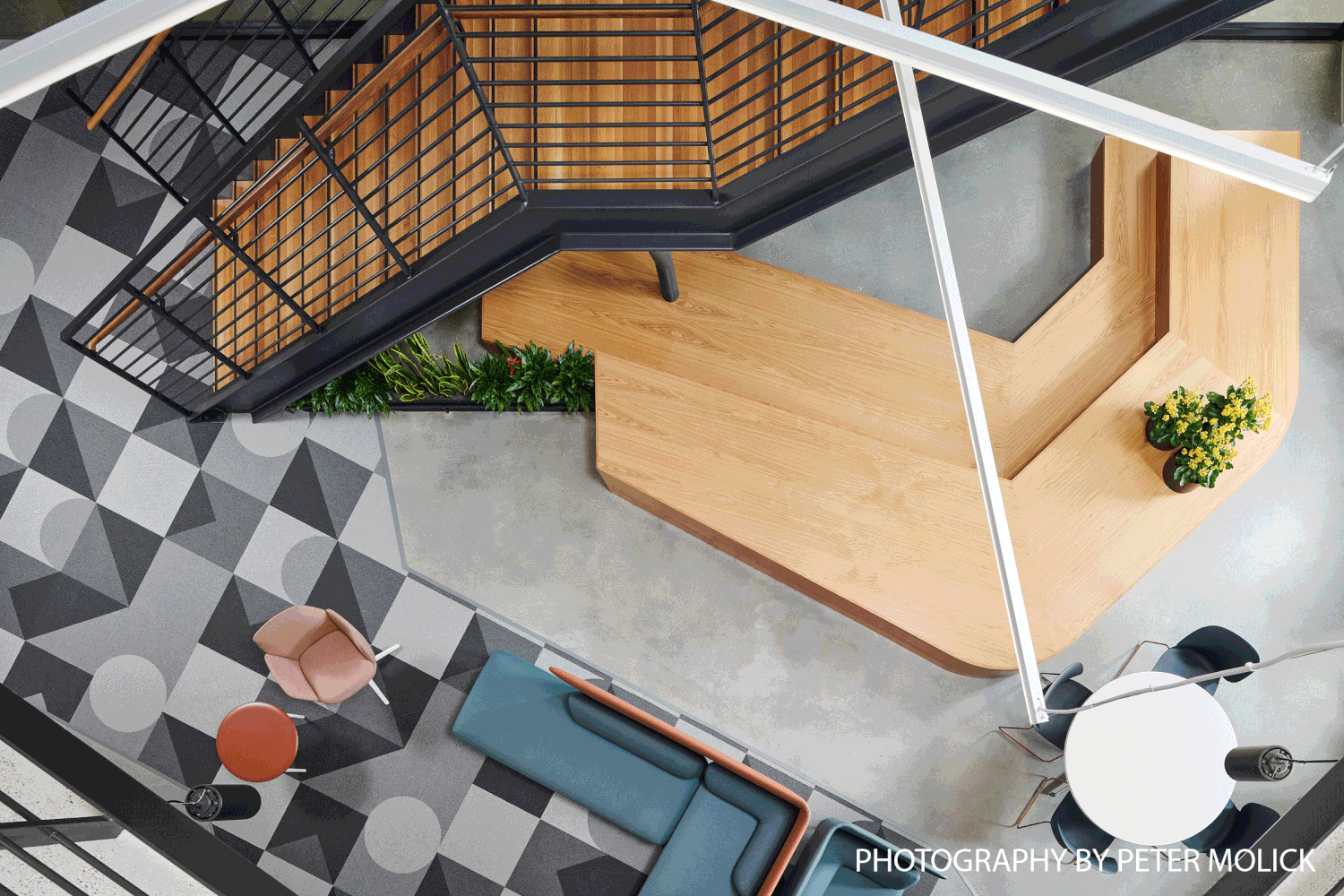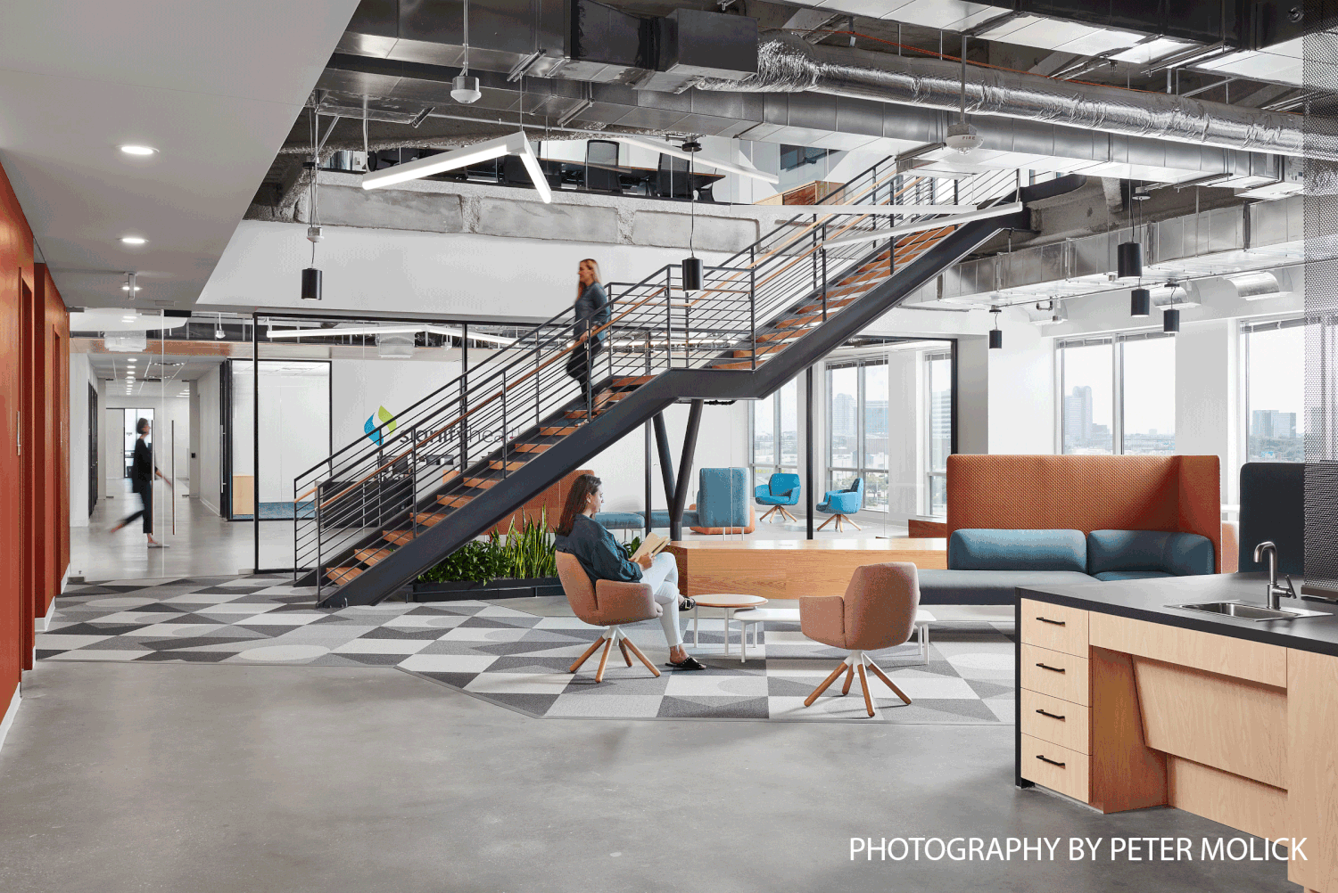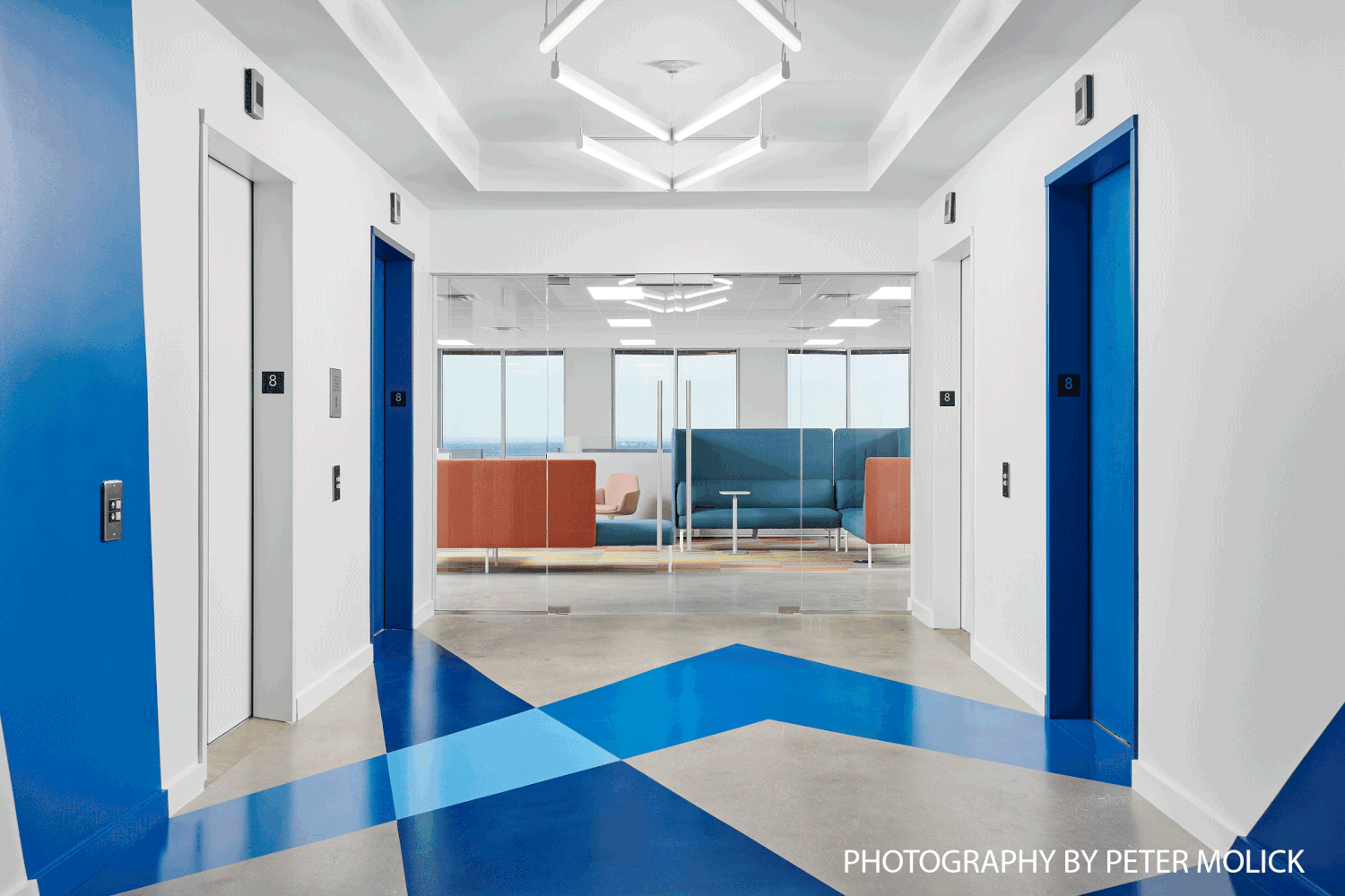 My individual contributions ran from the beginning of the project until the end. I was charged with leading field verification and completed a majority myself. I drafted the plans sketched out by the lead designer, as I had no prior knowledge of Revit and was required to learn. Although we were challenged with our budget, our team used paint and color to design simple, fun, and cost-effective graphics. My idea for the elevator lobby paint stemmed from the desire to invite people into the space, bringing the paint around the corner to inspire curiosity and a visual connection to the office. The same concept takes place at stairwells, where a splash of color runs down the stair door and up into the opposing collaboration space. I was also responsible for designing the area rugs made from carpet shape tiles that can be seen throughout the office, as well as the lighting fixture at the main staircase. This project continued to be an incredible learning opportunity after the design and CD phases. I worked very closely with my project manager and project architect as I was the only designer left on the project for construction administration. I quickly learned how to see a project through the CA phase, answering all RFIs and submittals.